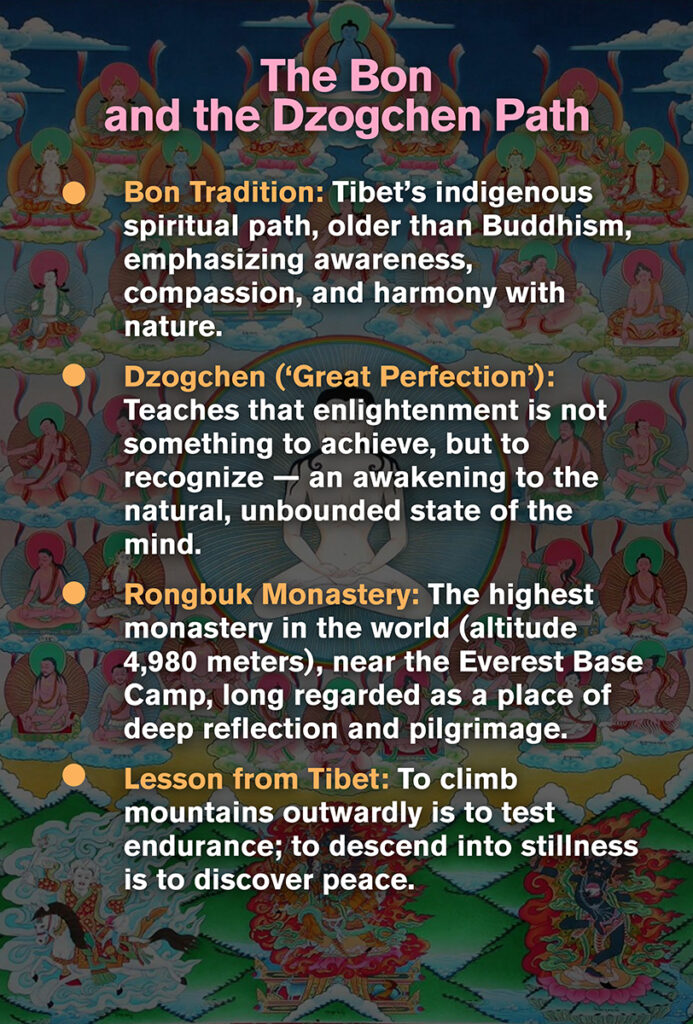 The Dzogchen teachings of the Bon tradition, which predate the introduction of Buddhism in Tibet, teach that awareness and emptiness are the mind’s natural state — luminous, boundless, and compassionate. Drawn to this wisdom and powered by a special bond of discipline, we — a band of eight close friends from the United States, Europe, and the Philippines — prepared six months in advance, not only for the physical and biochemical demands of Tibet’s altitude, but also for a deeper understanding of the history, culture, and practices that shaped Tibetan Buddhism exactly where and how it began.