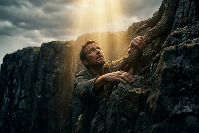 There was a tale of a man who had plummeted from the edge of a steep cliff during the night. As he descended, he managed to grasp the root of a tree that was protruding from the cliff, and he was literally hanging on for his life.