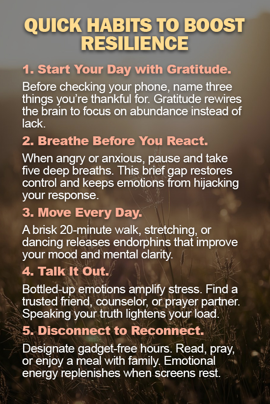 Emotional resilience is not inherited; it’s built, one day at a time. It grows through honesty, connection, gratitude, and faith. It doesn’t mean being unbreakable—it means learning how to bend without falling apart.