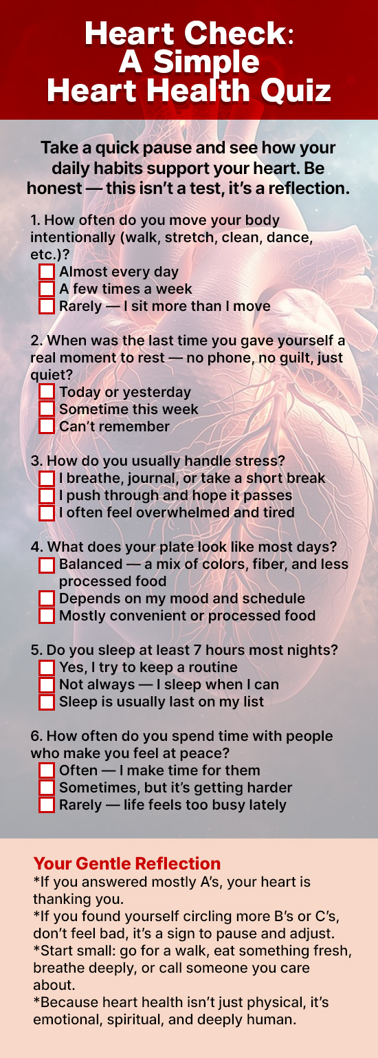 If you’re curious about where your own heart habits stand, take the Heart Health Quiz. Sometimes awareness alone can be the beginning of real care.
