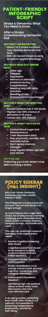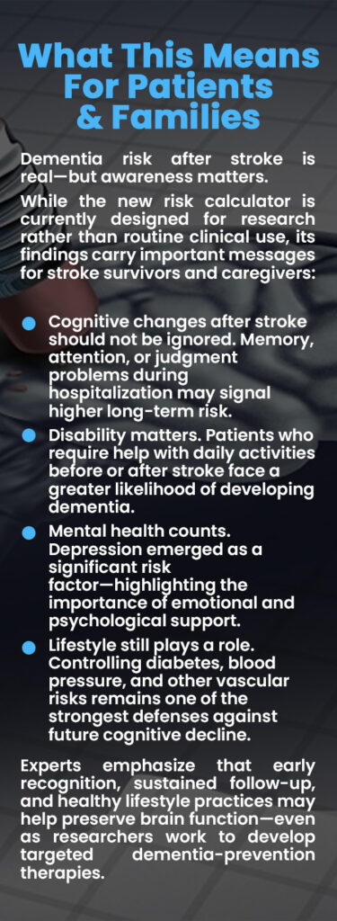 To address this gap, researchers developed a bedside-friendly risk calculator that stratifies patients into five levels of dementia risk based on age, disability, stroke type, and other health factors.