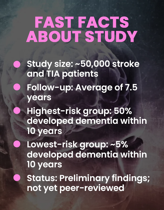 The findings are preliminary and based on a research abstract presented at a scientific meeting. The study has not yet been peer-reviewed, and researchers lacked imaging data that could clarify stroke size, location, or specific dementia subtypes.