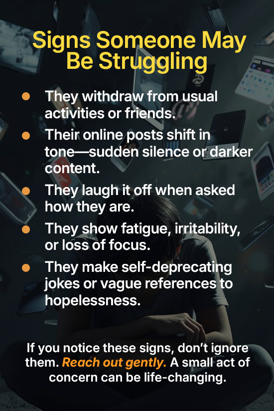 As we scroll through our feeds each day, let’s pause and remember that behind every smiling photo is a story we may never know. Let’s choose compassion over judgment, and kindness over criticism. Because one thoughtful message, one moment of listening, one sincere word of care can quietly save a life.